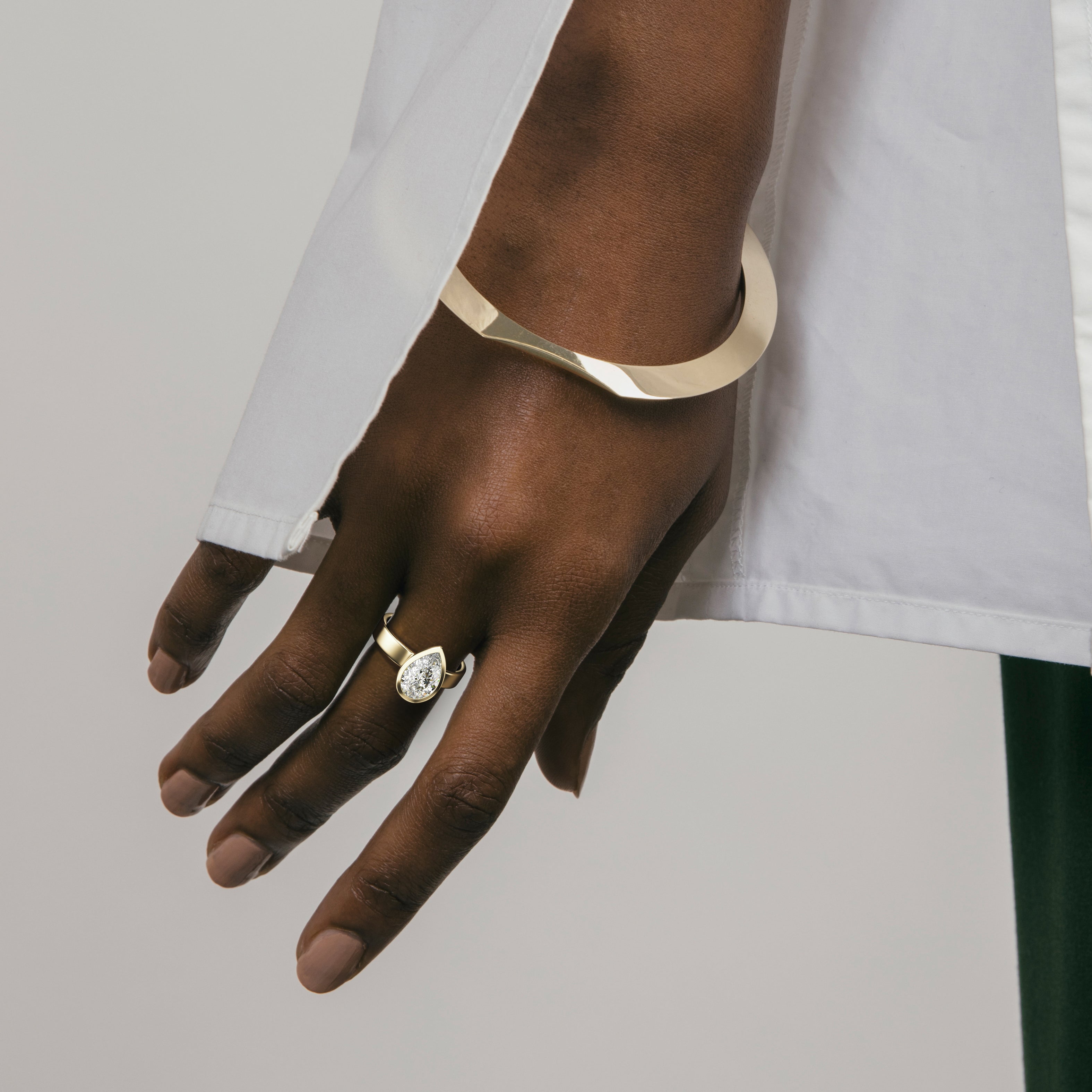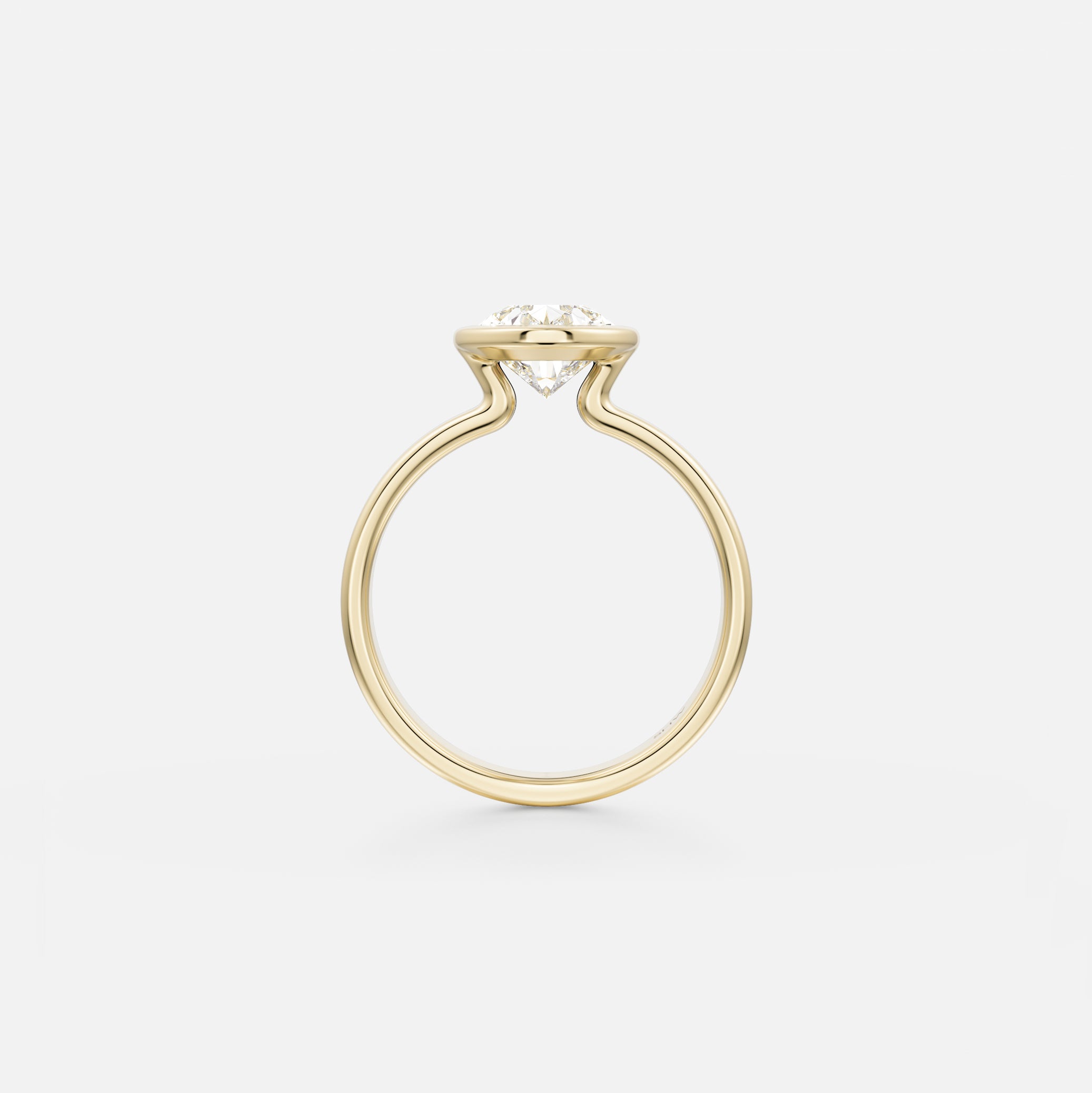 Our Badi Ring features a flat band that extends into a bezel setting that accentuates and secures your gemstone into place. Open from the sides, the ring is designed to stack flush with your wedding band.
