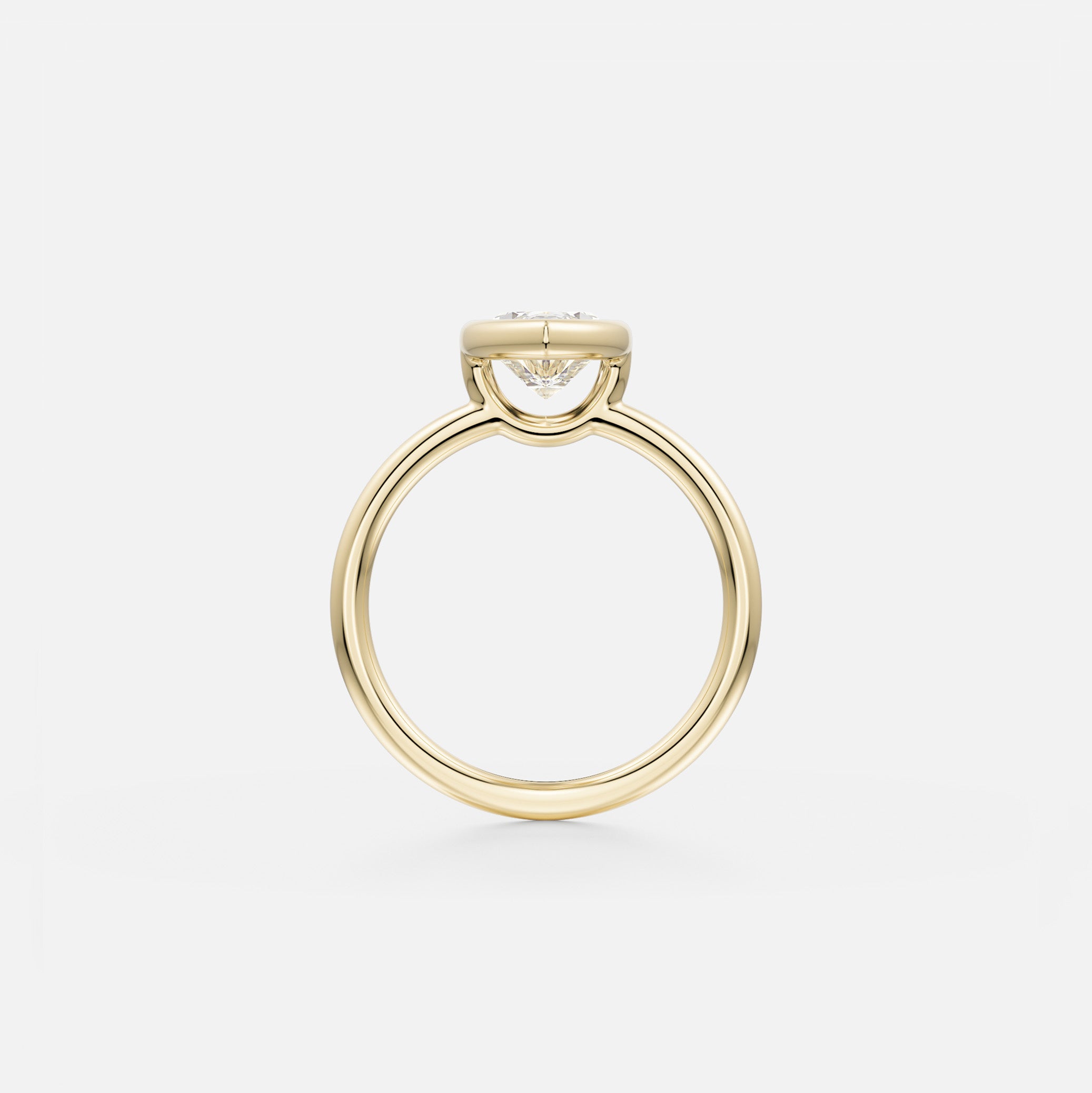 Beneath our Arti Ring’s sleek bezel setting, a crescent shaped window displays a unique view into the bottom of any diamond or gemstone placed in this design. The ring’s thin round profile offers a modern, timeless silhouette.