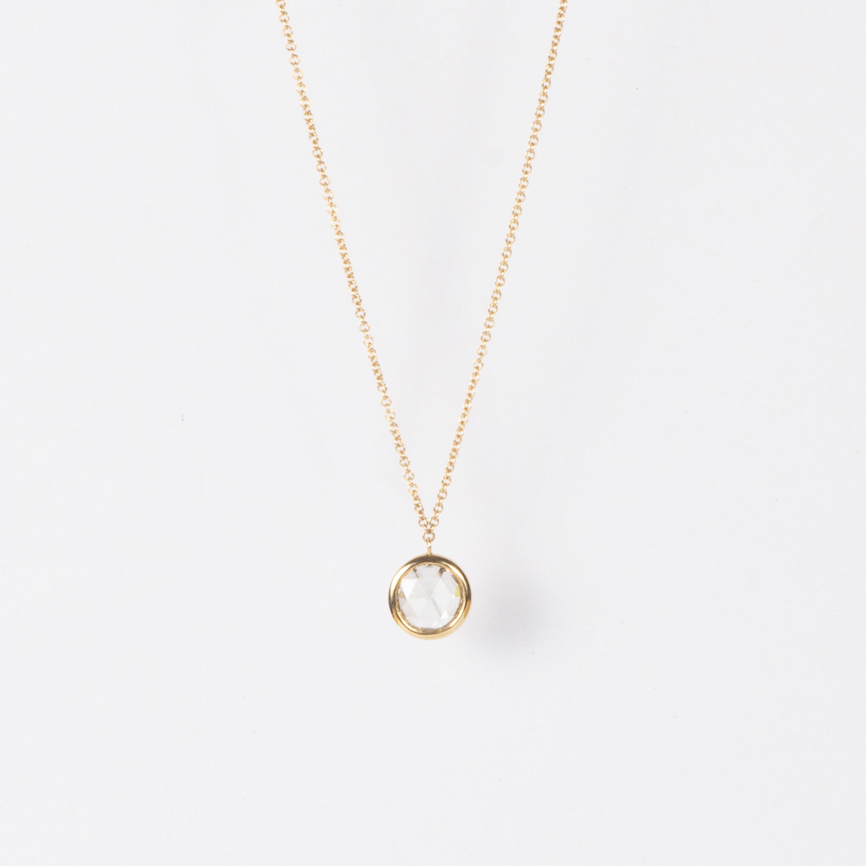 Available in 14 karat yellow gold with a lab-grown rose-cut white diamond, pendant is 0.4 inches in diameter